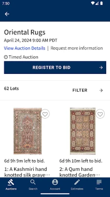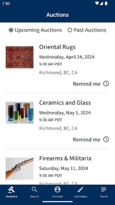 - View the Auction Calendar of Upcoming and Past Auctions. - Search Lots. - Save Favorite Lots. - Register for Upcoming Auctions. - Receive reminders to ensure you never miss a chance to Bid in an Auction. - Leave Absentee Bids. - Bid Live. - Track your Bidding Activity.