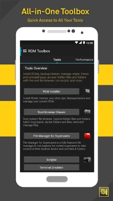 ROM Toolbox combines apps like Titanium Backup, SetCPU, MetaMorph, Autorun Manager, Terminal Emulator, Scripter, SD Boost, BuildProp Editor, Font Installer, Boot Animations & many more apps into an all-in-one app!